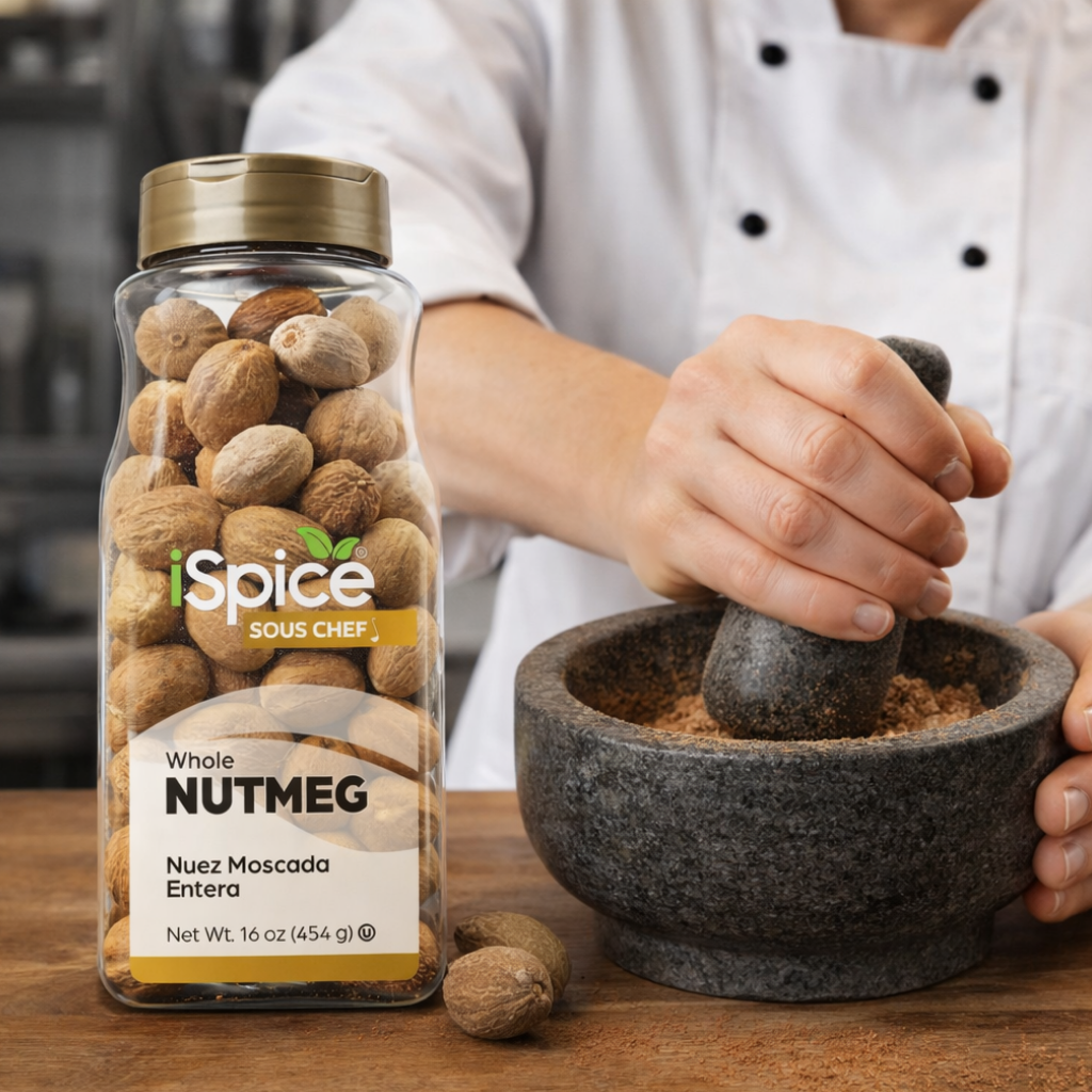 Enhance your dishes with the warm, aromatic flavor of iSpice Whole Nutmeg, offered in a generous 16 oz bulk size. These premium, Kosher-certified whole nutmeg seeds deliver a rich, slightly sweet taste with hints of clove and pepper, perfect for both sweet and savory recipes.