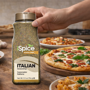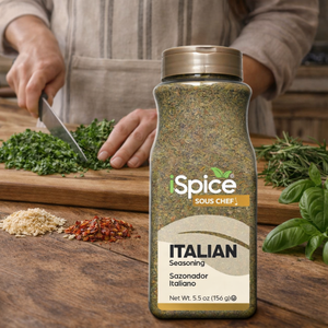 Capture the essence of Italy with iSpice Italian Seasoning, a 5.5 oz food service size of a delicious blend of premium herbs and spices. This Kosher-certified seasoning is a perfect combination of oregano, basil, thyme, rosemary, garlic powder, and other savory spices, providing a classic Italian flavor profile.